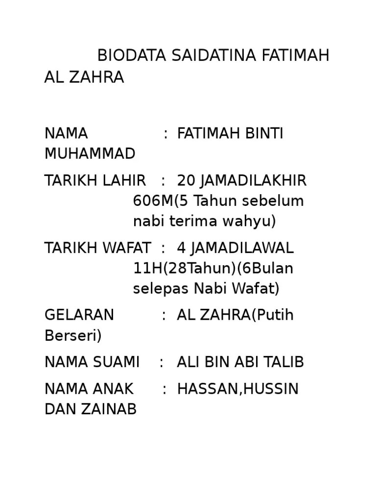 Biodata Saidatina Fatimah : Saidatina Fatimah Az Zahra